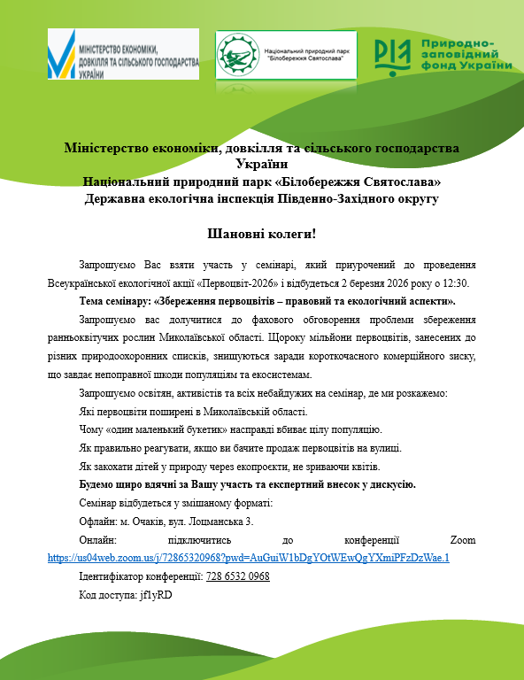 23 лютого 2026 року працівники Національного природного парку «Білобережжя Святослава» взяли участь у онлайн вебінарі “Охоронні зони – інструмент збереження біорізноманіття”.