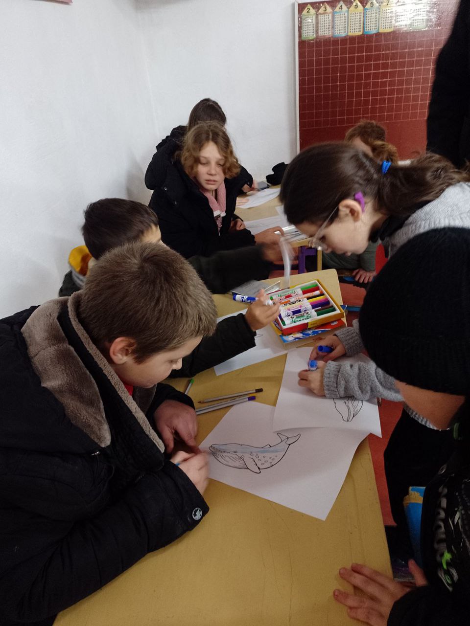 Учні початкової школи Тузлівського ліцею Коблівської сільської ради з фахівцем з екоосвіти НПП Білобережжя Святослава під час повітряної тривоги у бомбосховищі ознайомились з цікавою для них інформацією і на закріплення з задоволенням розфарбовували китів, а також спробували себе в пошитті м’якої іграшки.