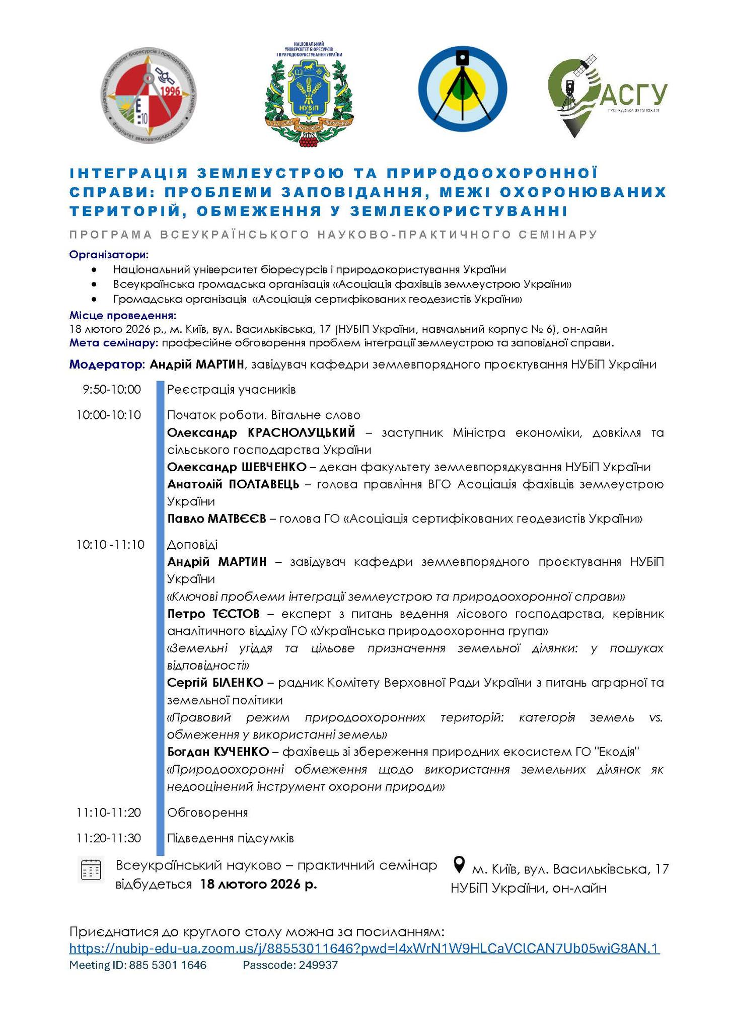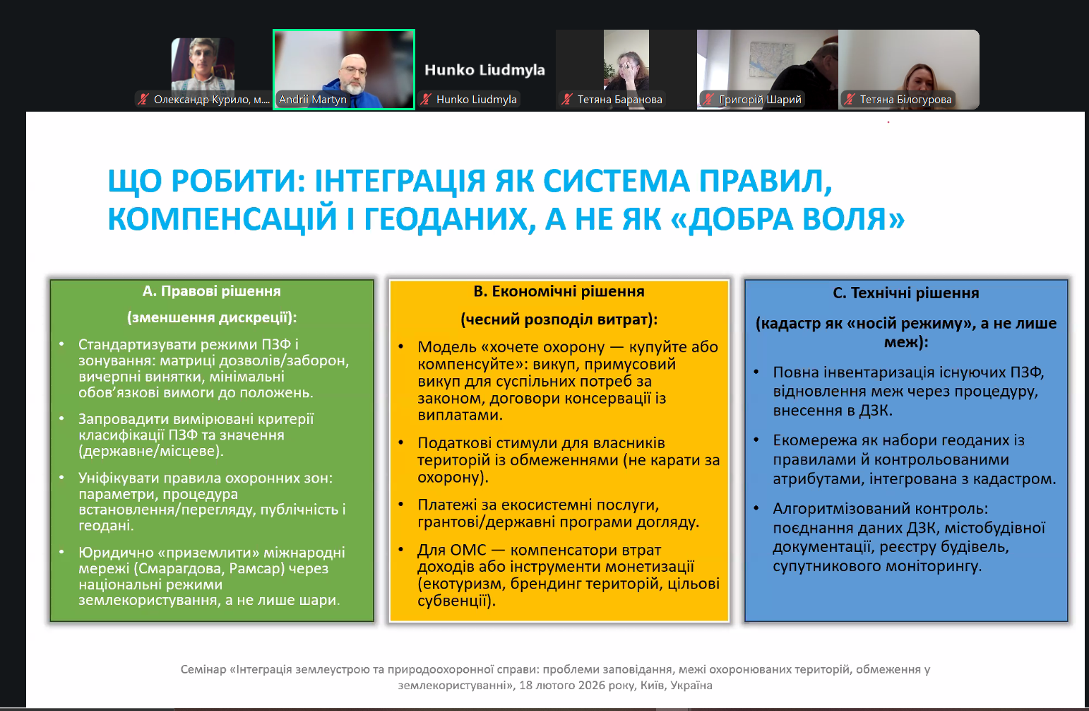 18 лютого 2026 року працівники науково-дослідного відділу взяли участь у всеукраїнському науково-практичному семінарі: «Інтеграція землеустрою та природоохоронної справи: проблеми заповідання, межі охоронюваних територій, обмеження у землекористуванні».