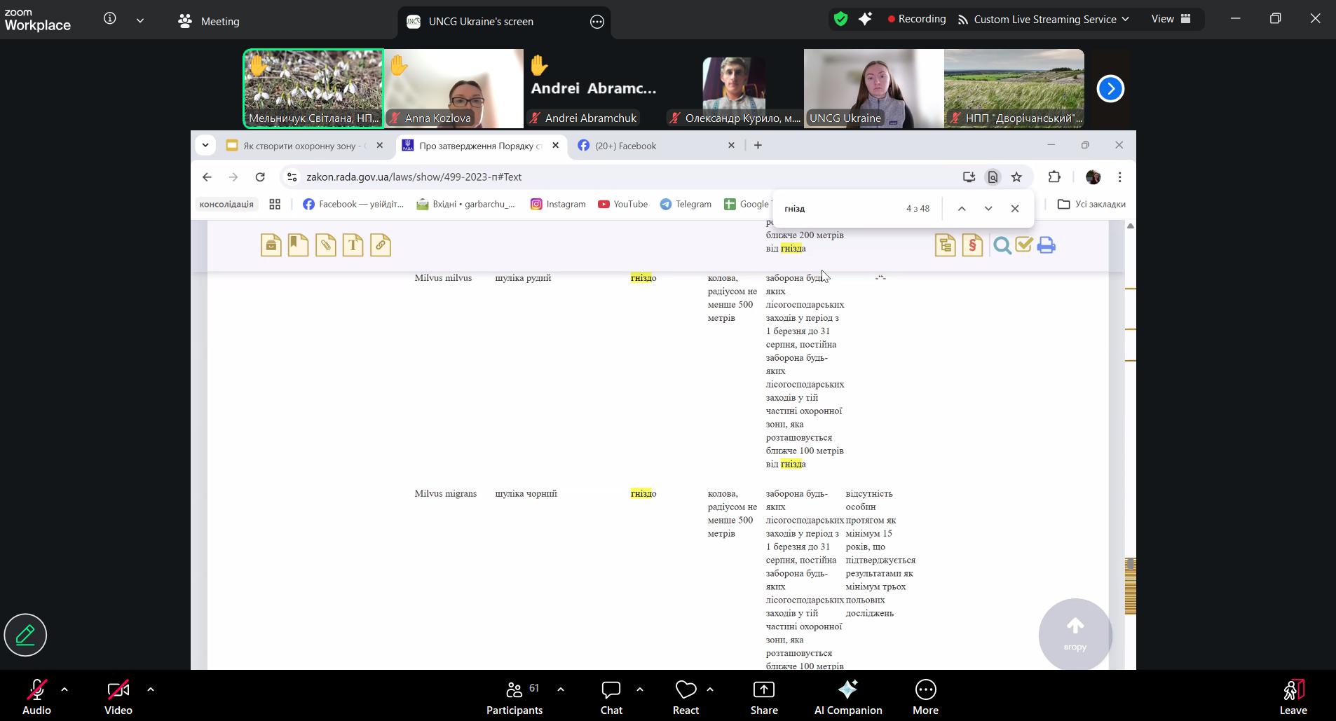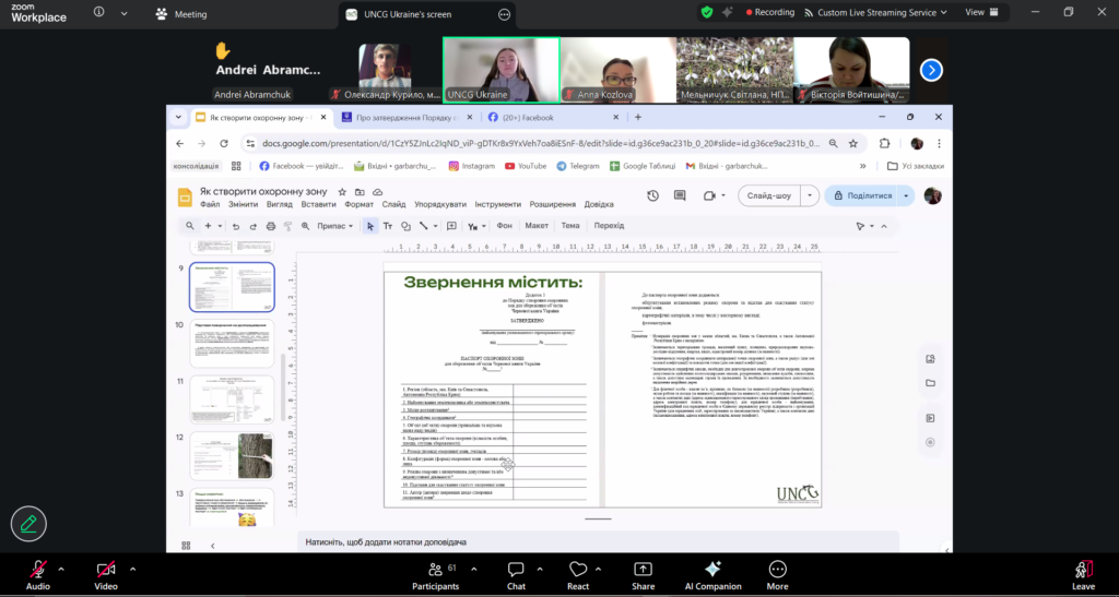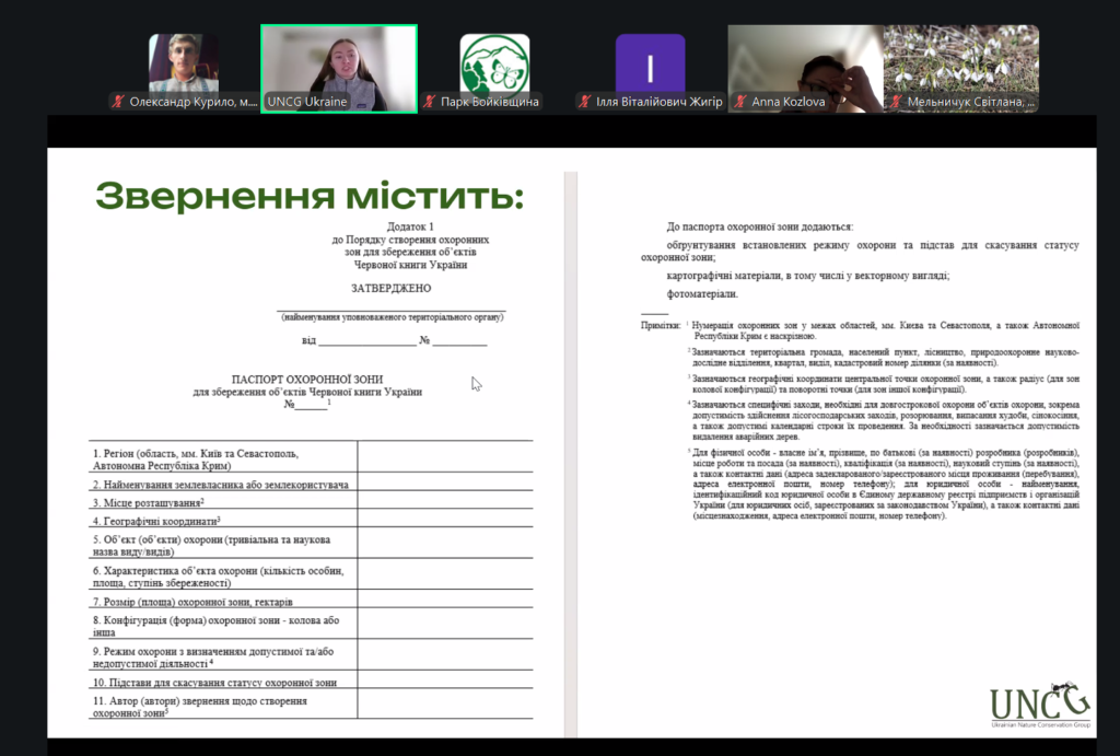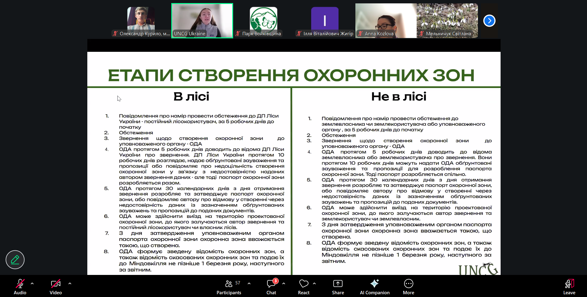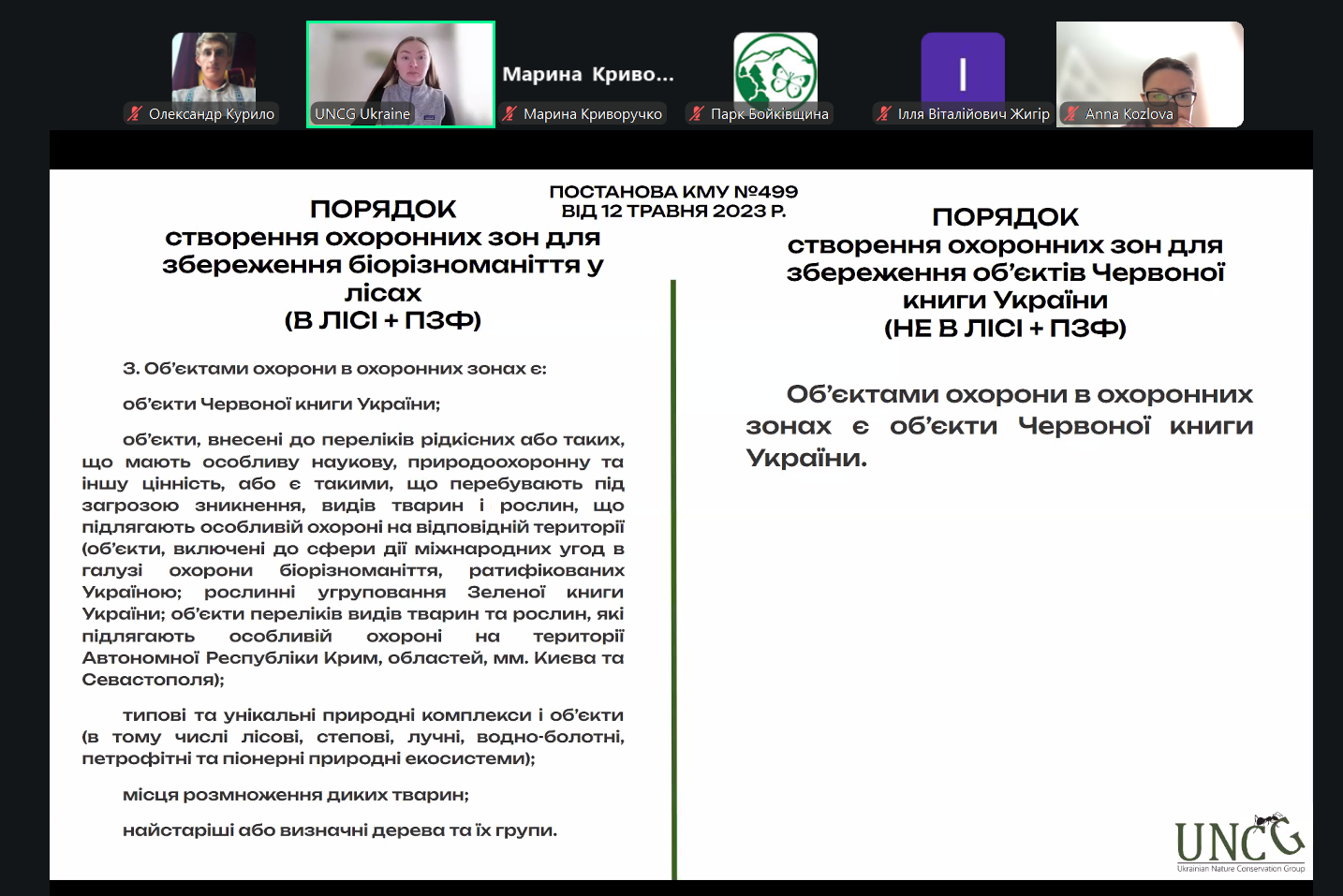 Захід був присвячений одному з важливих механізмів збереження природи – охоронним зонам. В межах вебінару було розглянуто (через призму створення охоронних зон) ряд важливих для збереження цінних з екологічної точки зору території питань: що таке охоронні зони і чим вони відрізняються від об’єктів природно-заповідного фонду; процедуру створення охоронних зон; виклики, з якими можна зіштовхнутися у процесі.