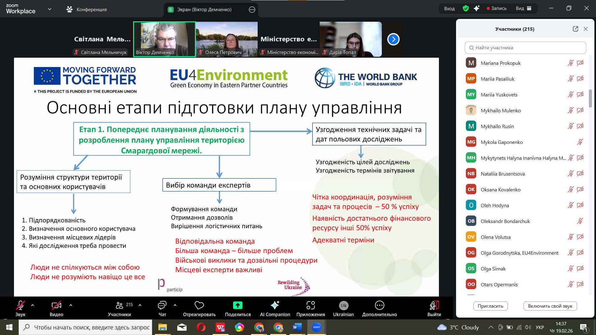 Під час дискусії детально обговорили проблеми управління територіями Смарагдової мережі, які територіально входять до складу різних територіальних громад та пропозиції змін до законодавства України для забезпечення виконання вимог Бернської конвенції та Оселищної і Пташинної директив ЄС стосовно спеціальних природоохоронних територій.