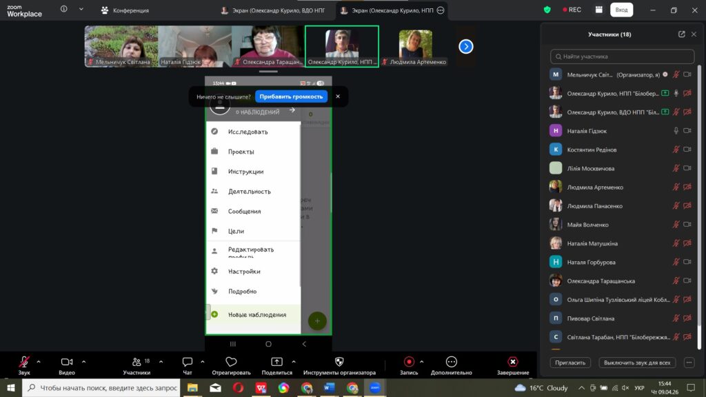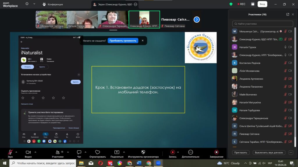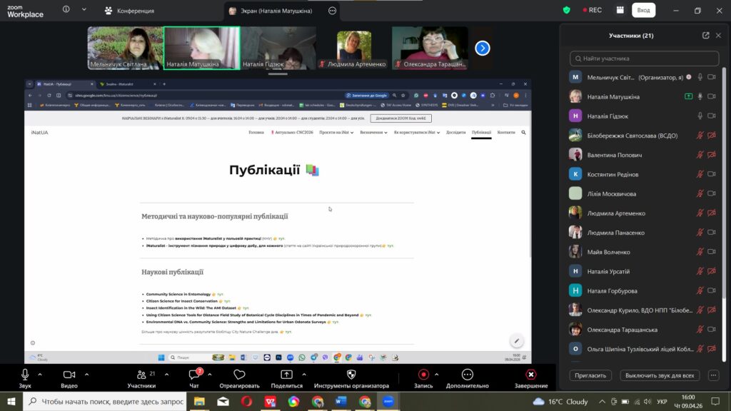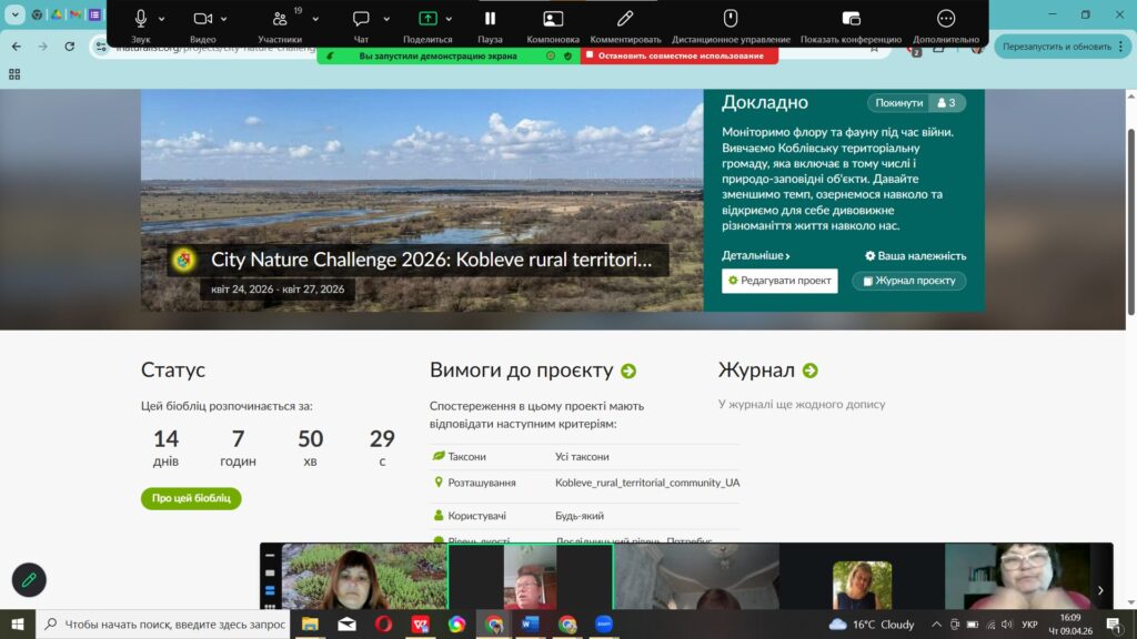 Вчора, 9 квітня, відбулося перше навчальне заняття від співробітників національного природного парку «Білобережжя Святослава» в рамках реалізації проєкту у міжнародному конкурсі з фіксації біорізноманіття  City Nature Challenge (CNC). Допомагали їм представники ГО «Мій напрям», кафедри екології та природоохоронних технологій Національного університету Кораблебудування ім. адм. Макарова. А сьогоднішній теоретичний вебінар відбувся для вчителів (Online) «Громадянська наука в освіті: участь шкіл у міжнародному проєкті City Nature Challenge 2026», які дізналися про всі секрети iNaturalist: