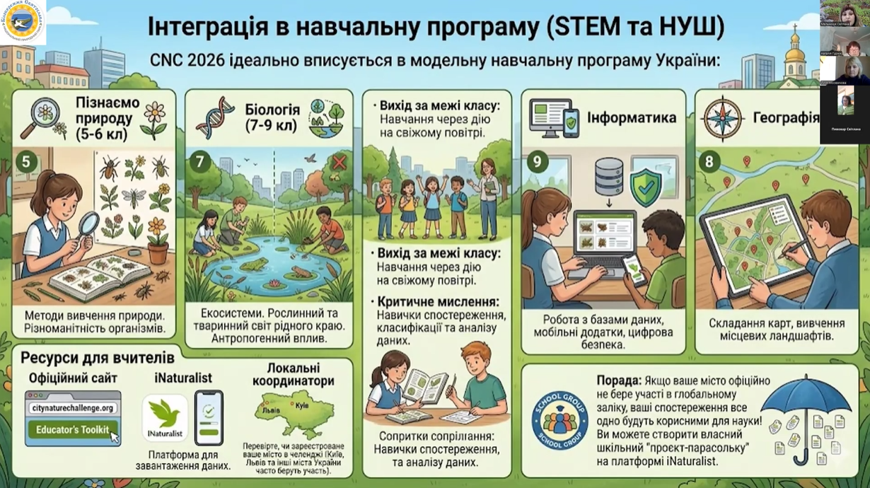 Вчора, 9 квітня, відбулося перше навчальне заняття від співробітників національного природного парку «Білобережжя Святослава» в рамках реалізації проєкту у міжнародному конкурсі з фіксації біорізноманіття  City Nature Challenge (CNC). Допомагали їм представники ГО «Мій напрям», кафедри екології та природоохоронних технологій Національного університету Кораблебудування ім. адм. Макарова. А сьогоднішній теоретичний вебінар відбувся для вчителів (Online) «Громадянська наука в освіті: участь шкіл у міжнародному проєкті City Nature Challenge 2026», які дізналися про всі секрети iNaturalist: