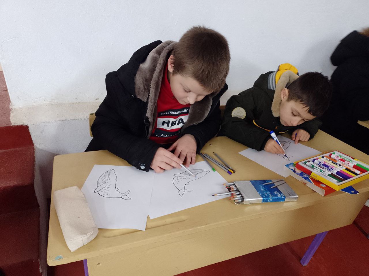 - 1) початківці Тузлівського ліцею з фахівцем з екоосвіти НПП Білобережжя Святослава під час повітряної тривоги у бомбосховищі ознайомились з цікавою для них інформацією і на закріплення з задоволенням розфарбовували китів, а також спробували себе в пошитті м’якої іграшки;